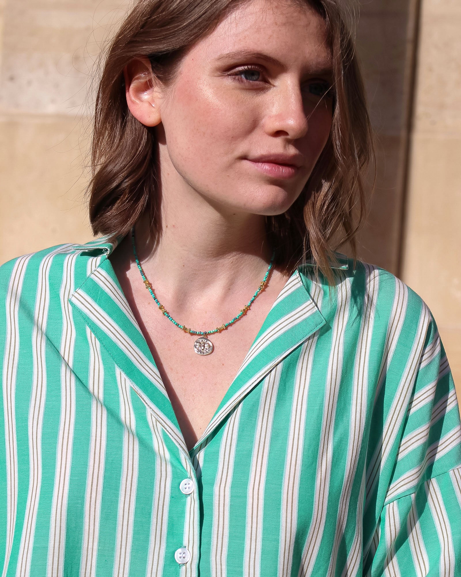 Le collier Arlequin apporte une touche bohème et estivale avec ses perles turquoise et sa médaille texturée. Il forme un ensemble avec le bracelet Arlequin.