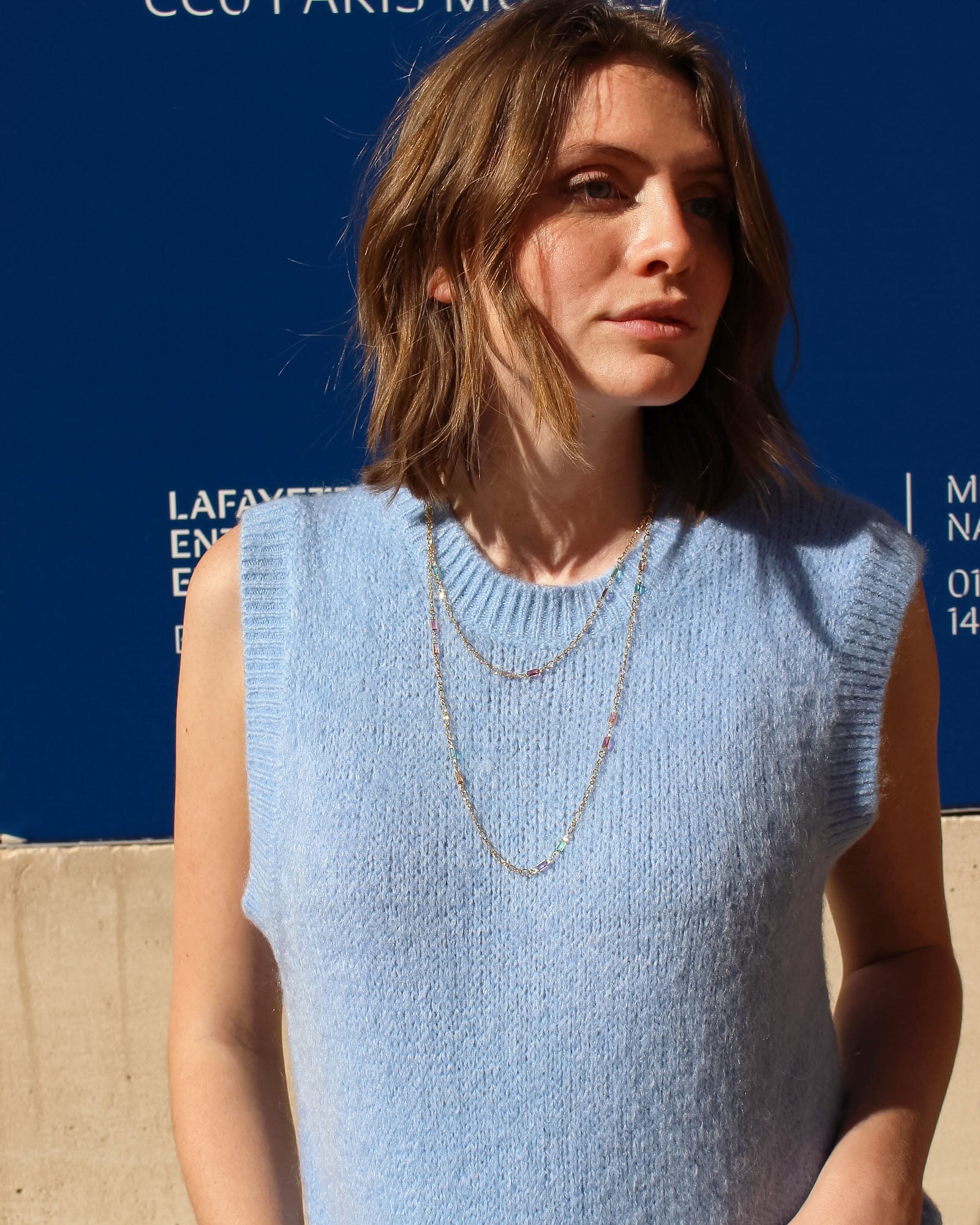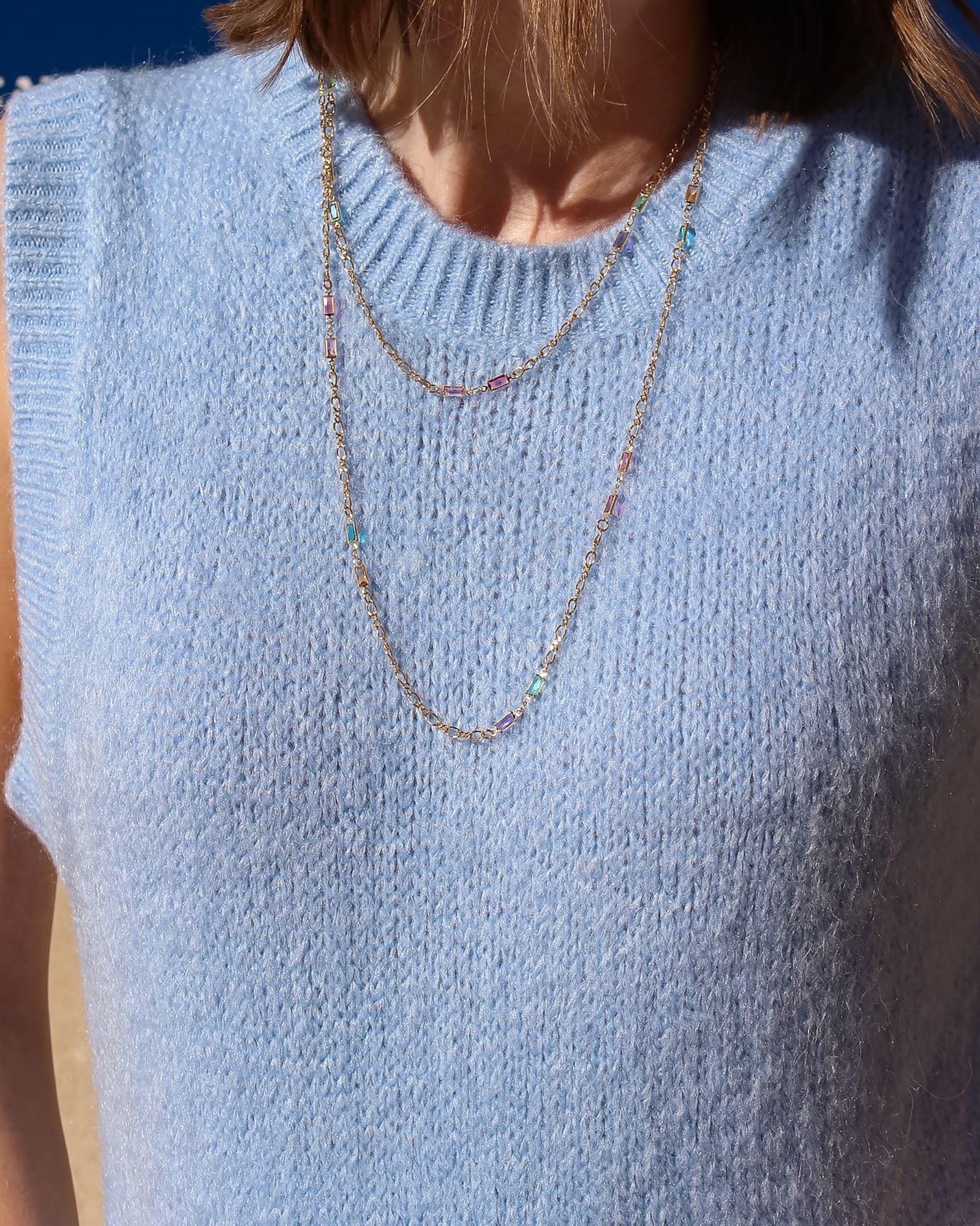 Le sautoir Yvonne apporte une touche de lumière et de couleur à vos silhouettes grâce à sa longue chaîne ponctuée d'éclats multipierres.