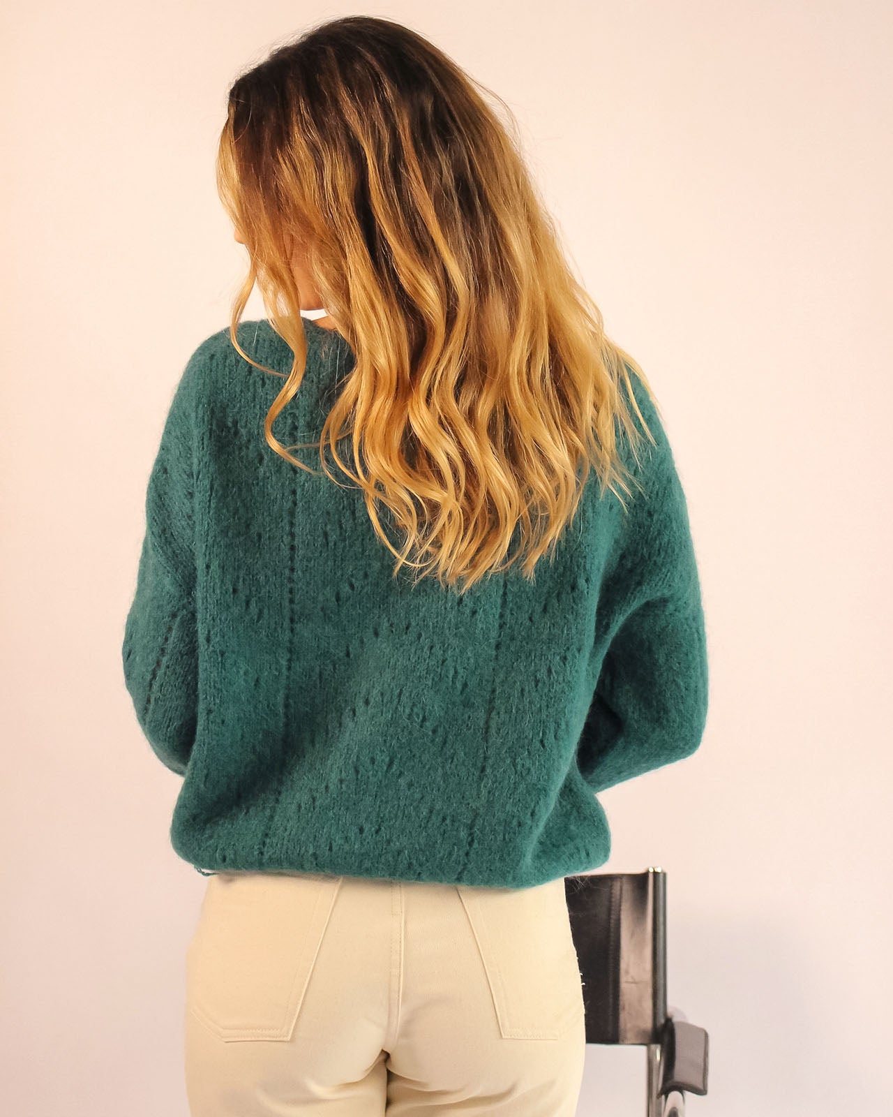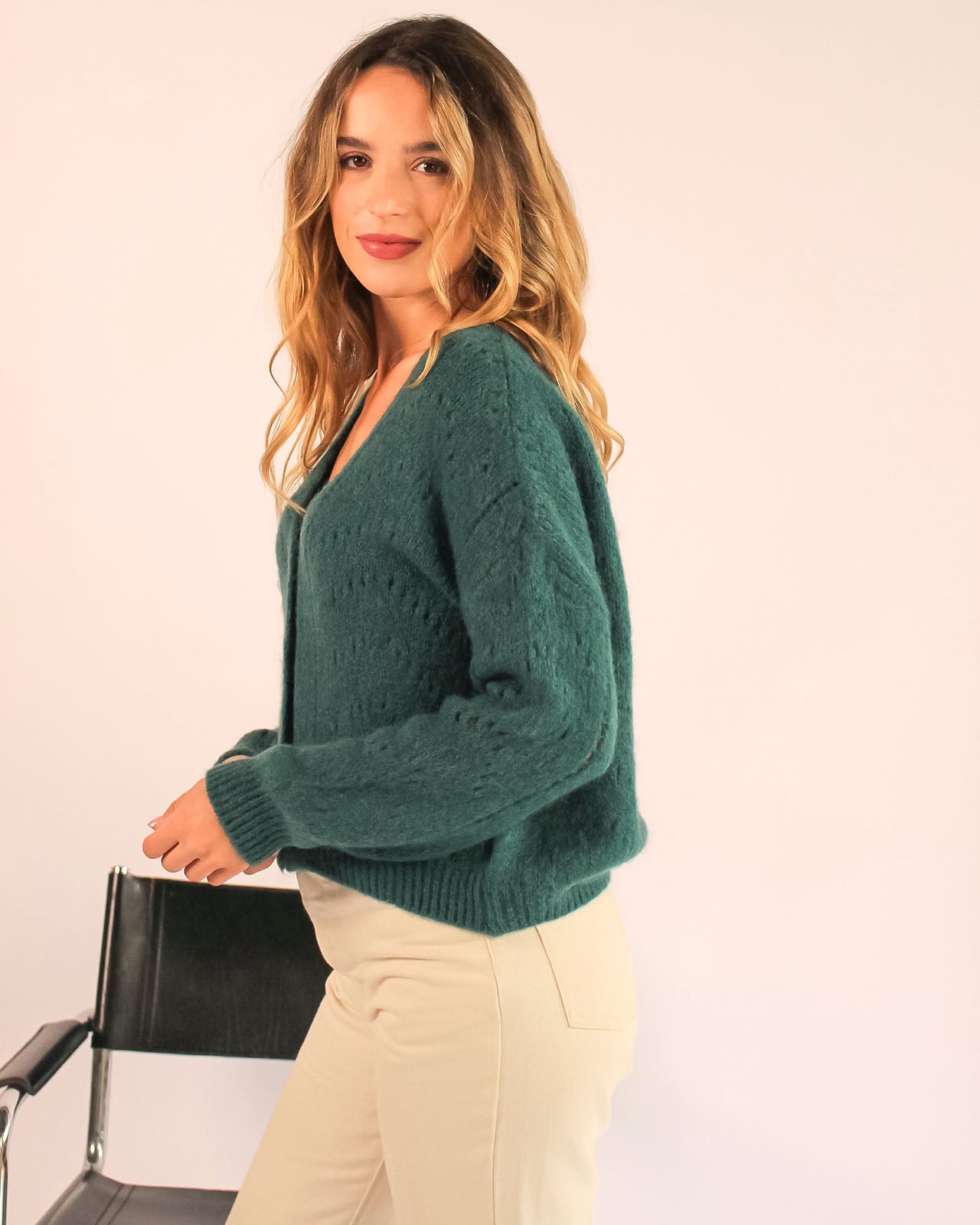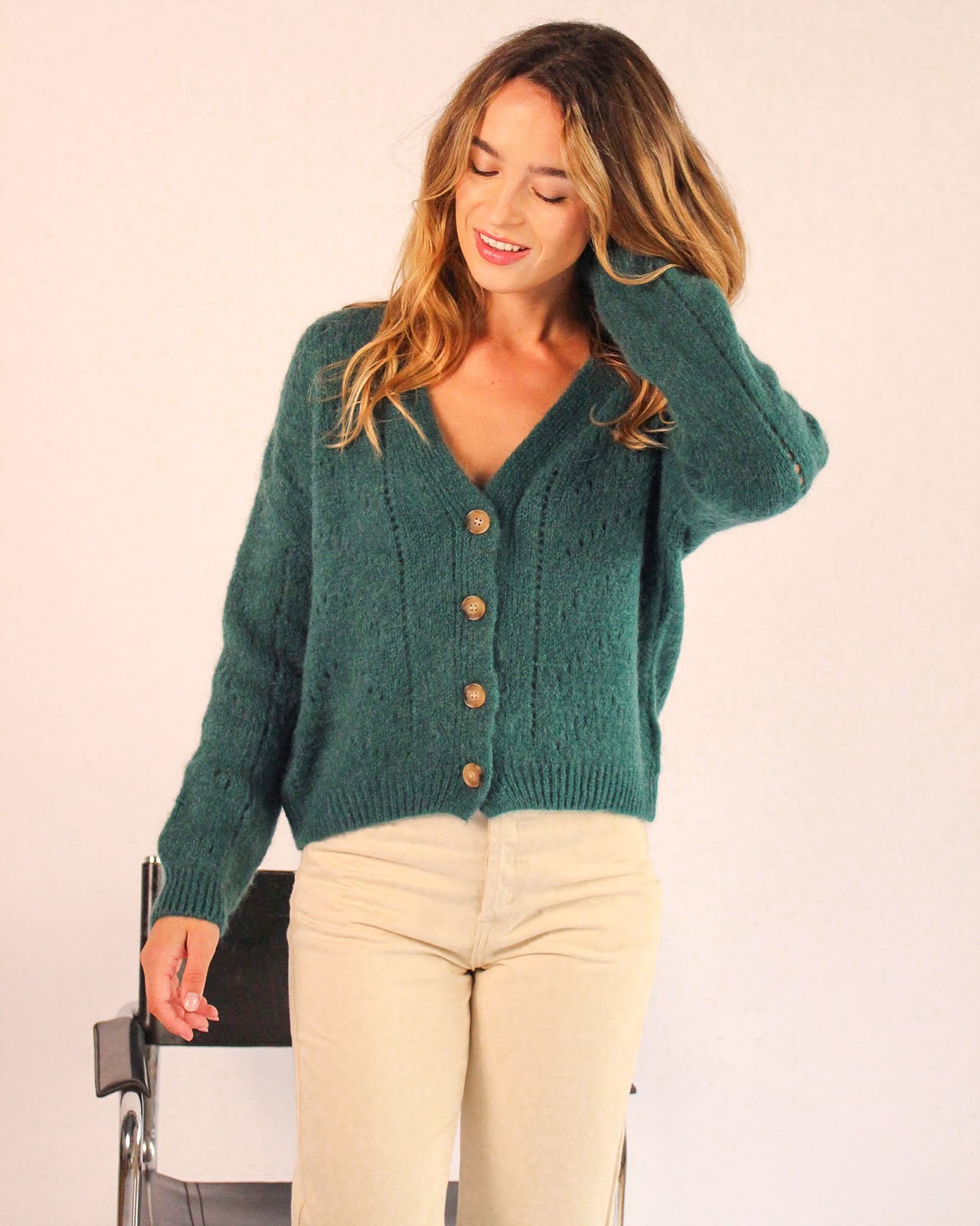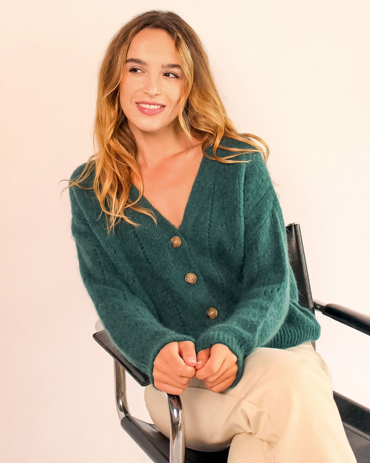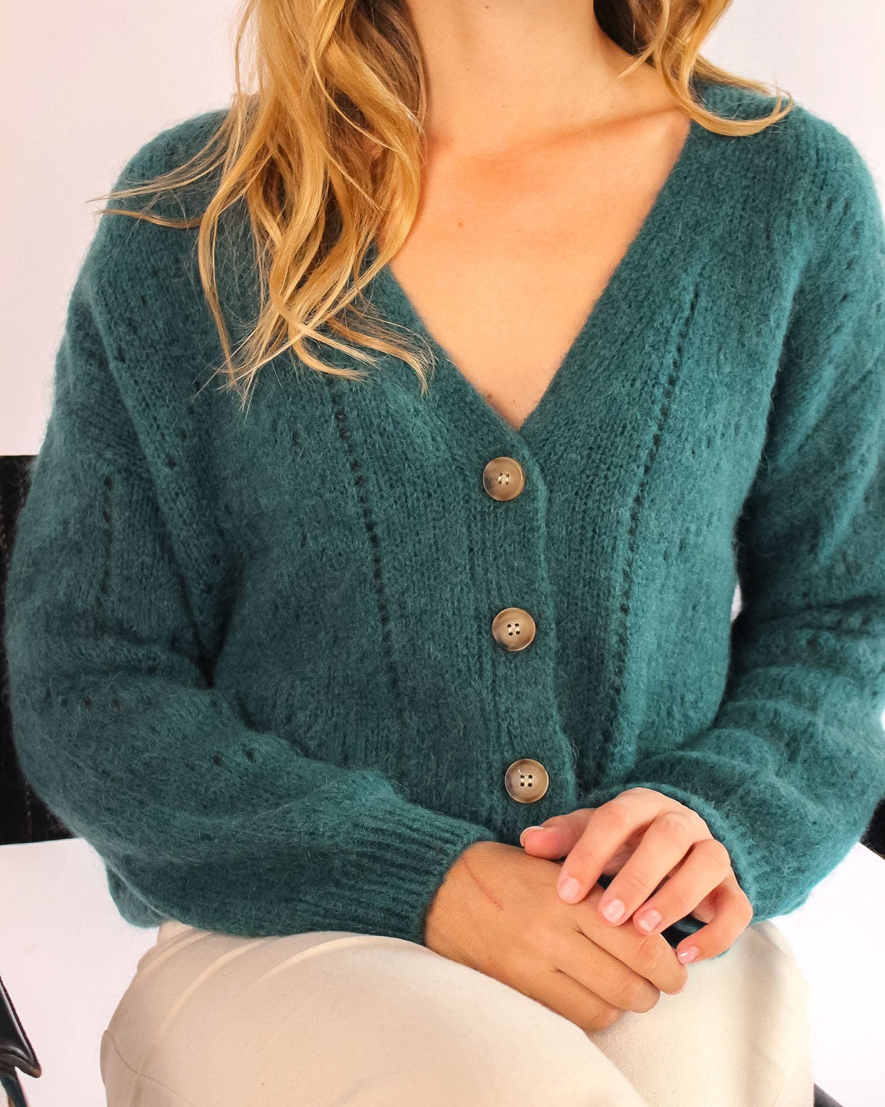 Le gilet Jasper, avec sa jolie maille ajourée, peut être porté à même la peau ou avec un top en-dessous.