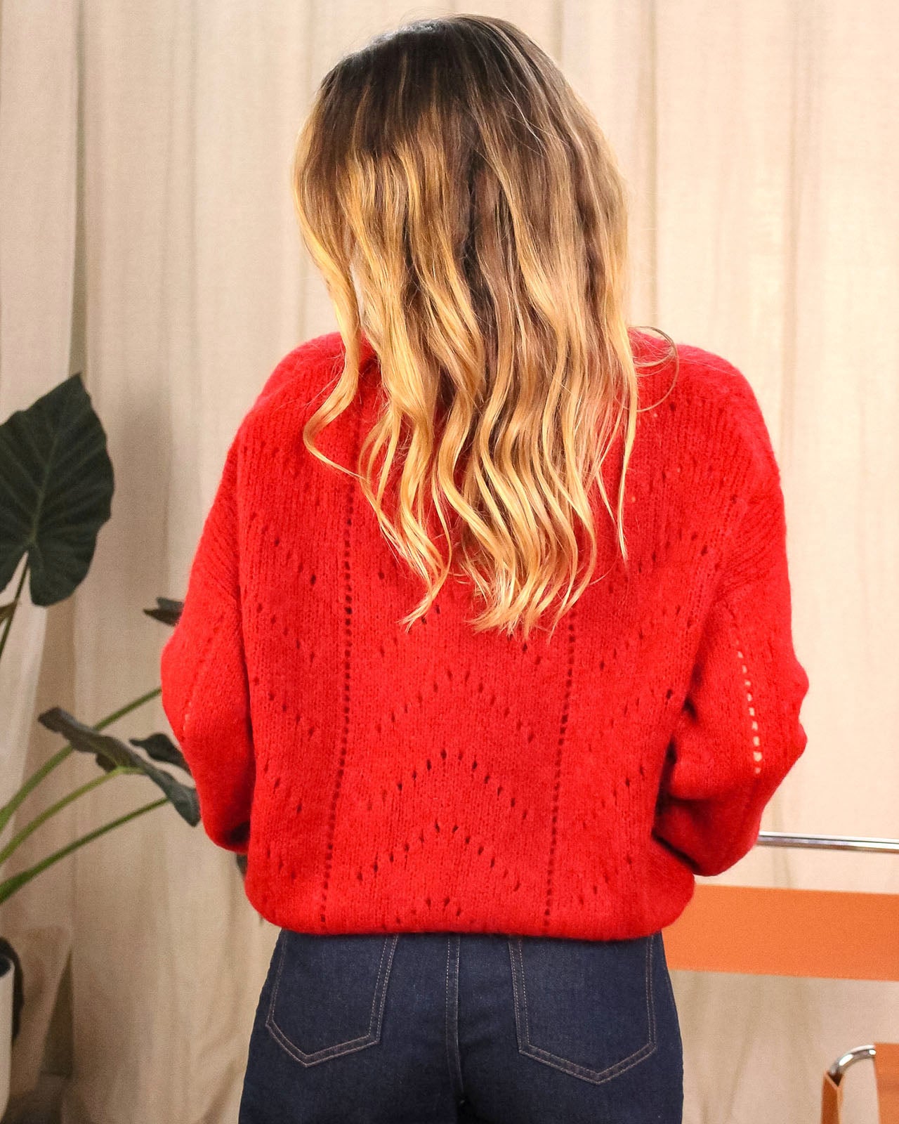 Le gilet Jasper, avec sa jolie maille ajourée, peut être porté à même la peau ou avec un top en-dessous.