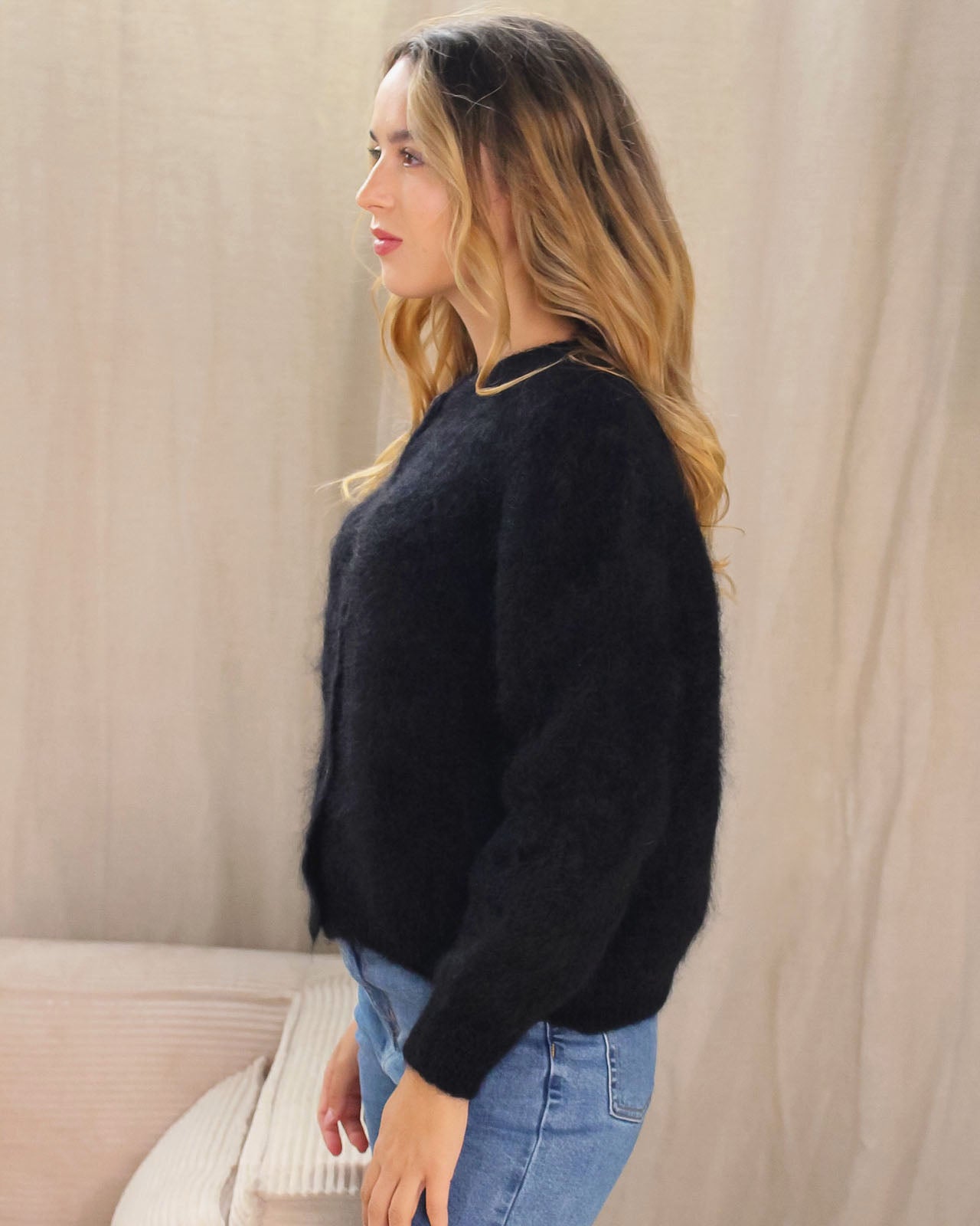 Une maille duveteuse et chaude en kid mohair : on adore le côté fluffy du gilet Carrick ! Il peut se porter boutonné jusqu'en haut comme un pull, ou ouvert sur un top.