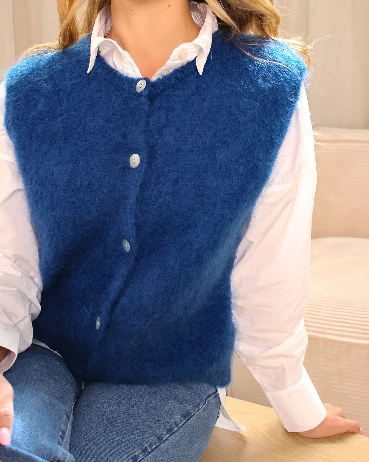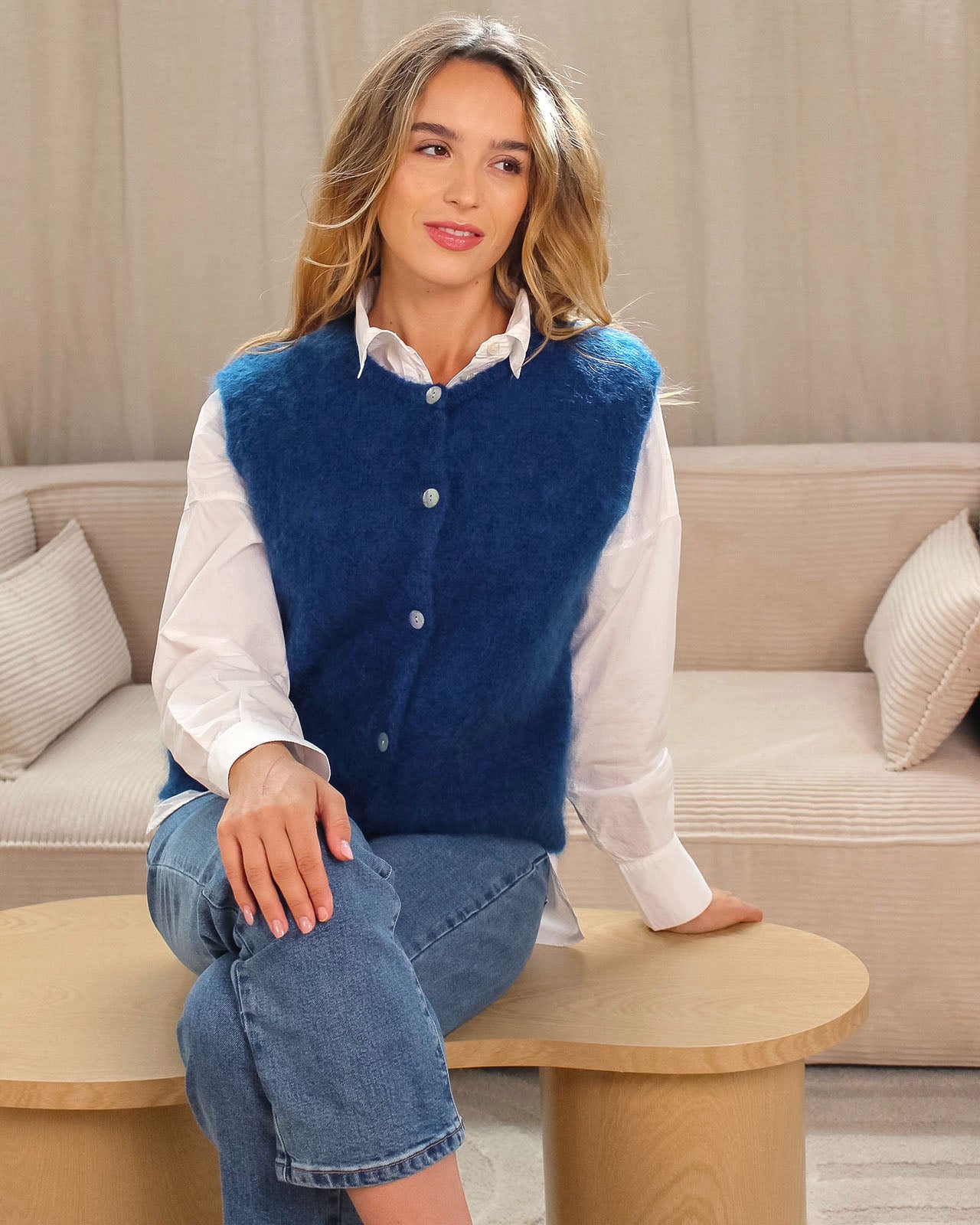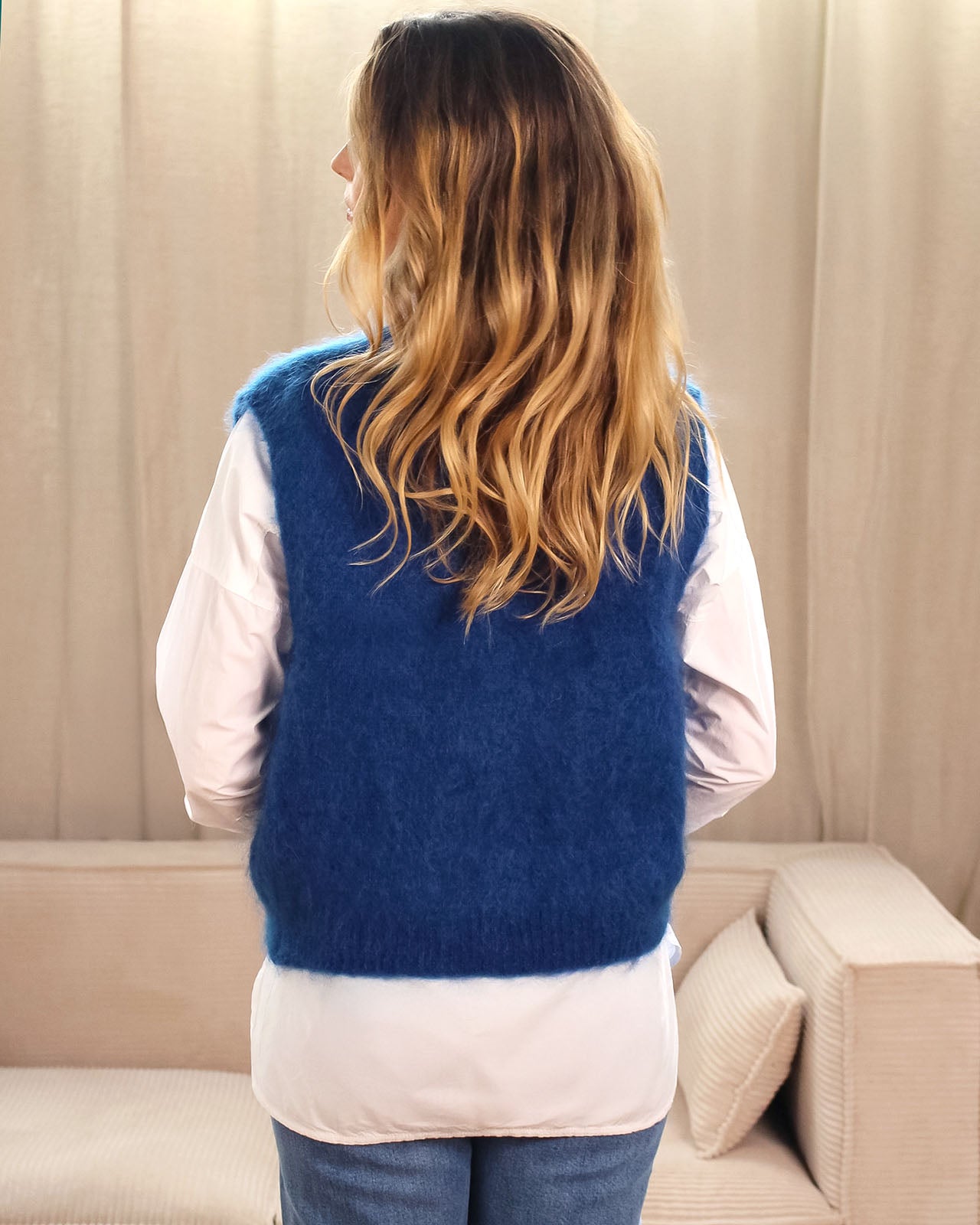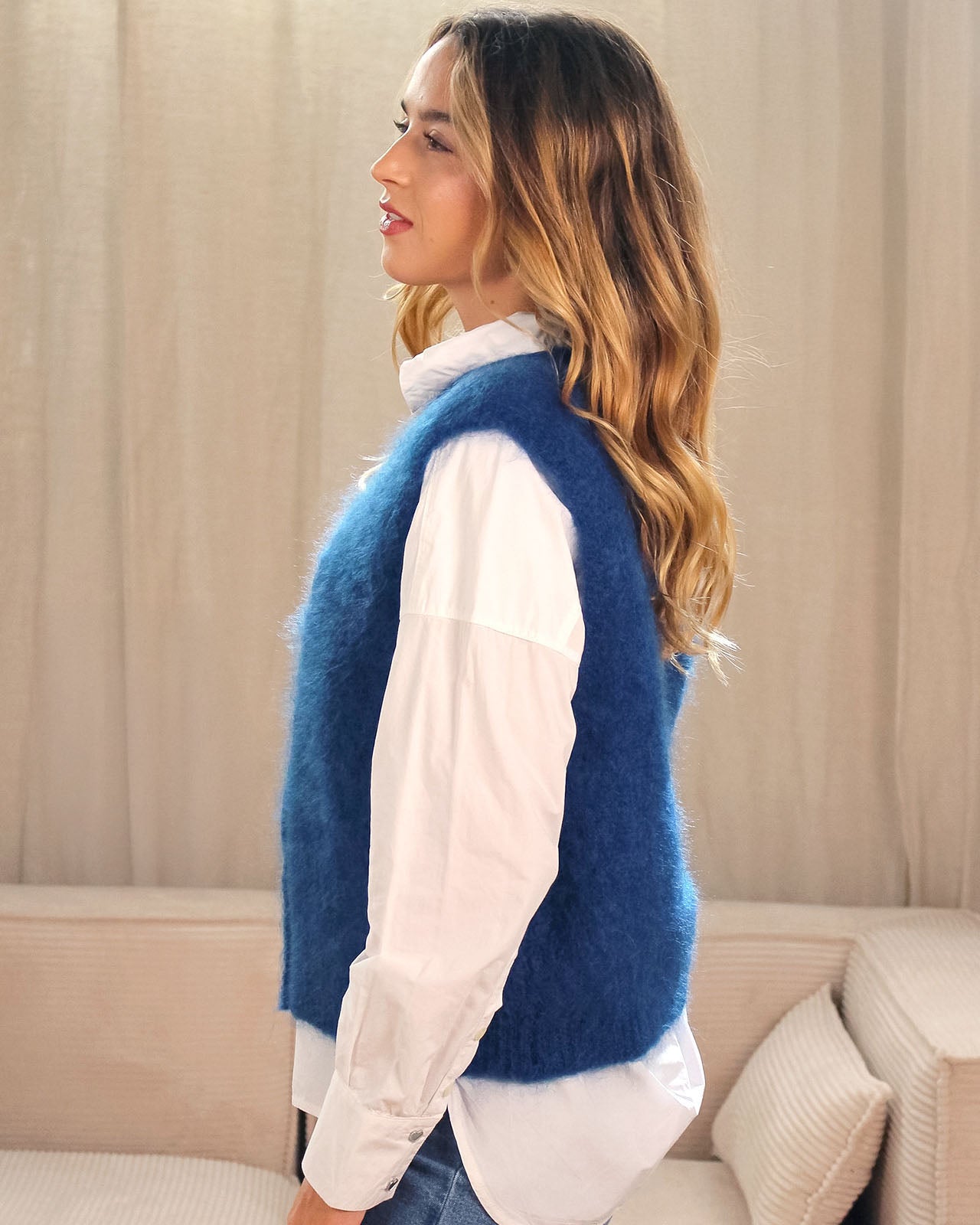 Le gilet Jimmy se porte sur une chemise ou un tee-shirt manches longues. On aime sa maille en mohair qui apporte une touche de douceur à nos looks !
