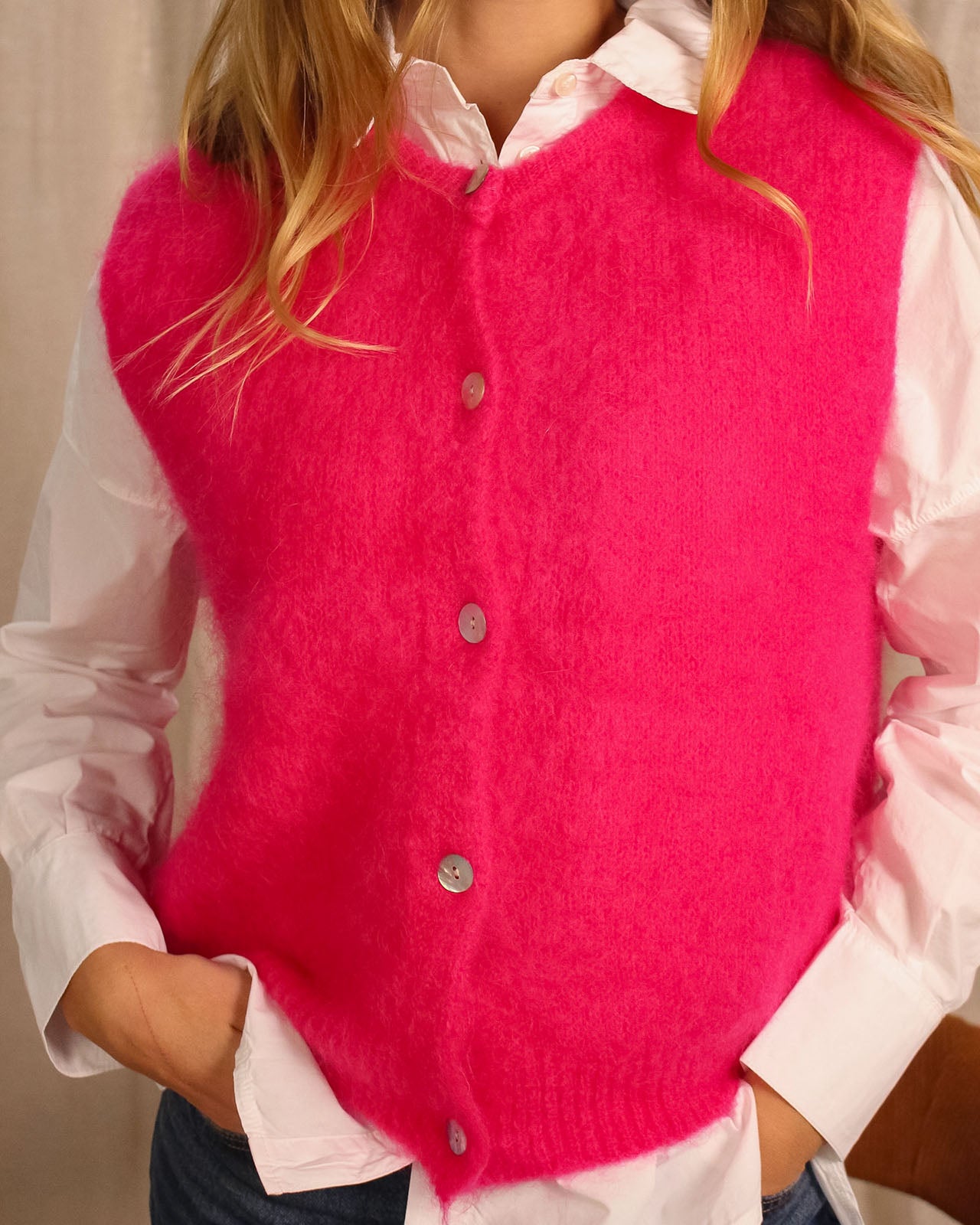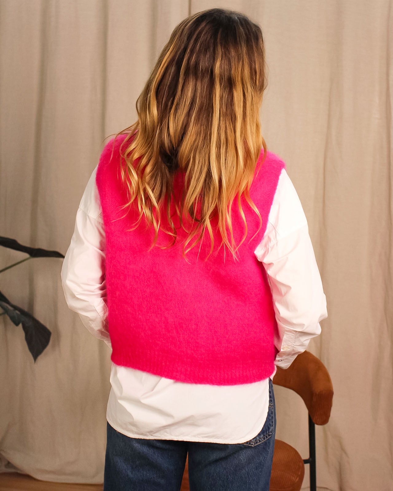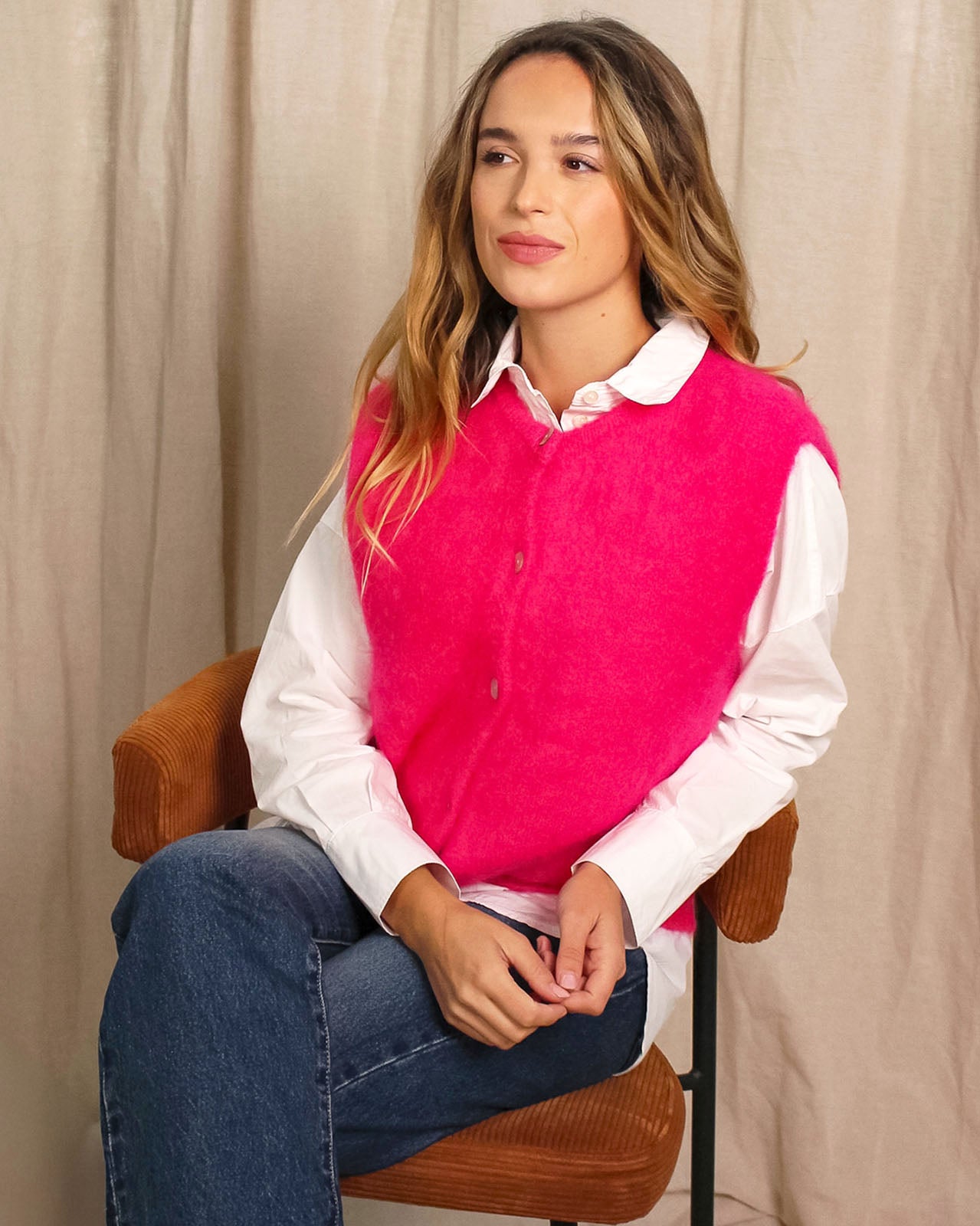 Le gilet Jimmy se porte sur une chemise ou un tee-shirt manches longues. On aime sa maille en mohair qui apporte une touche de douceur à nos looks !