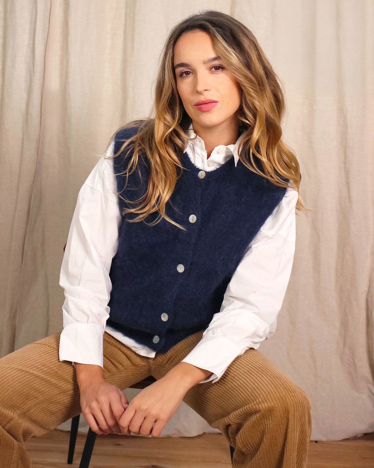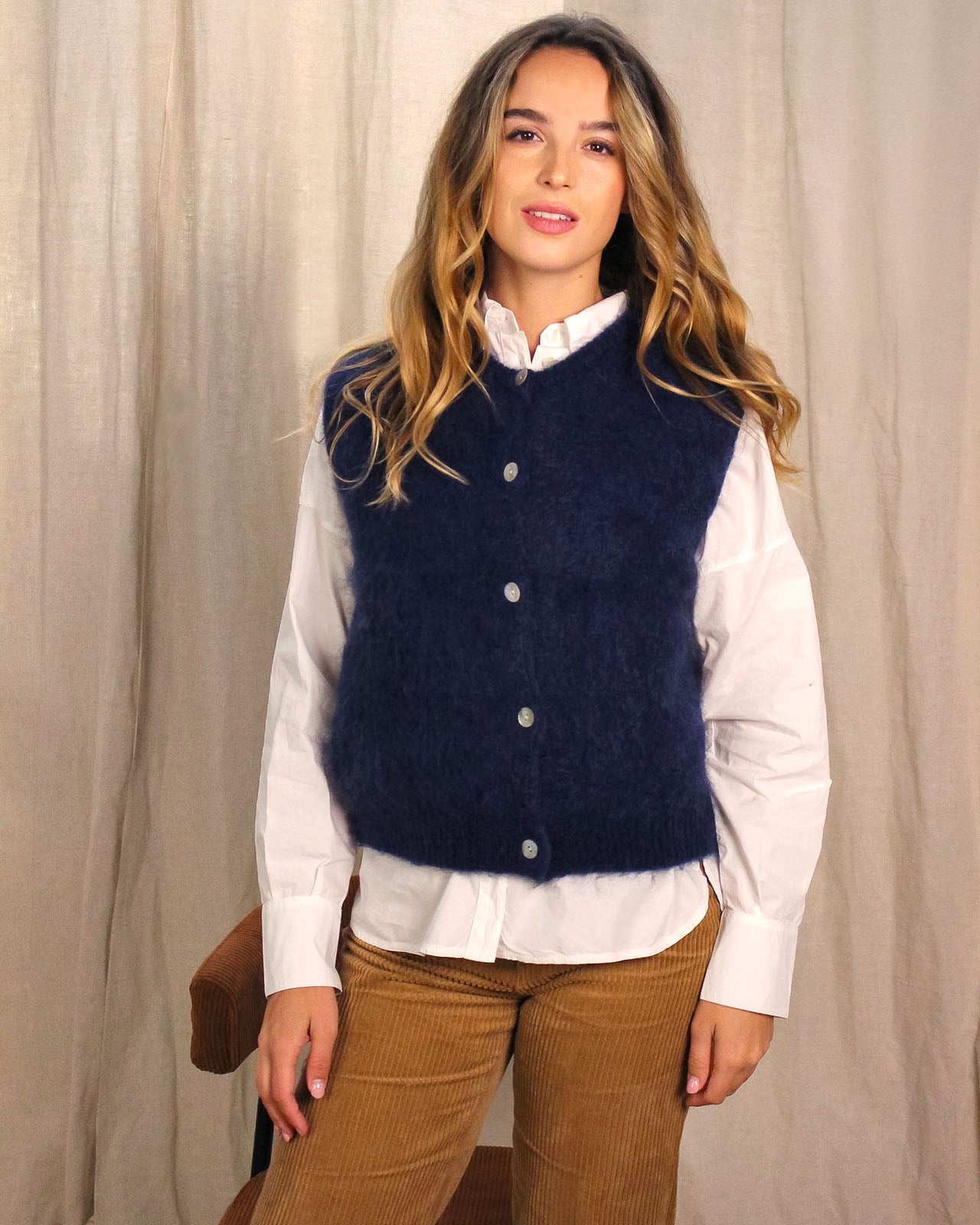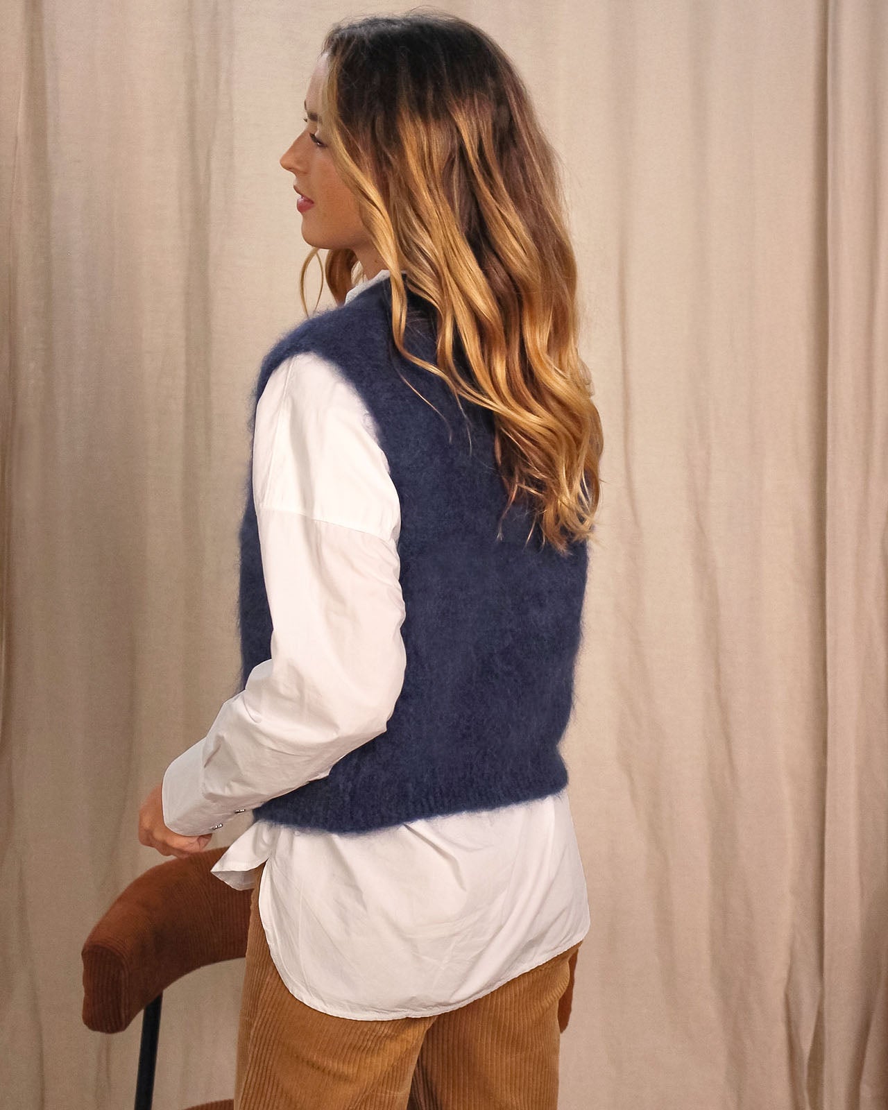 Le gilet Jimmy se porte sur une chemise ou un tee-shirt manches longues. On aime sa maille en mohair qui apporte une touche de douceur à nos looks !