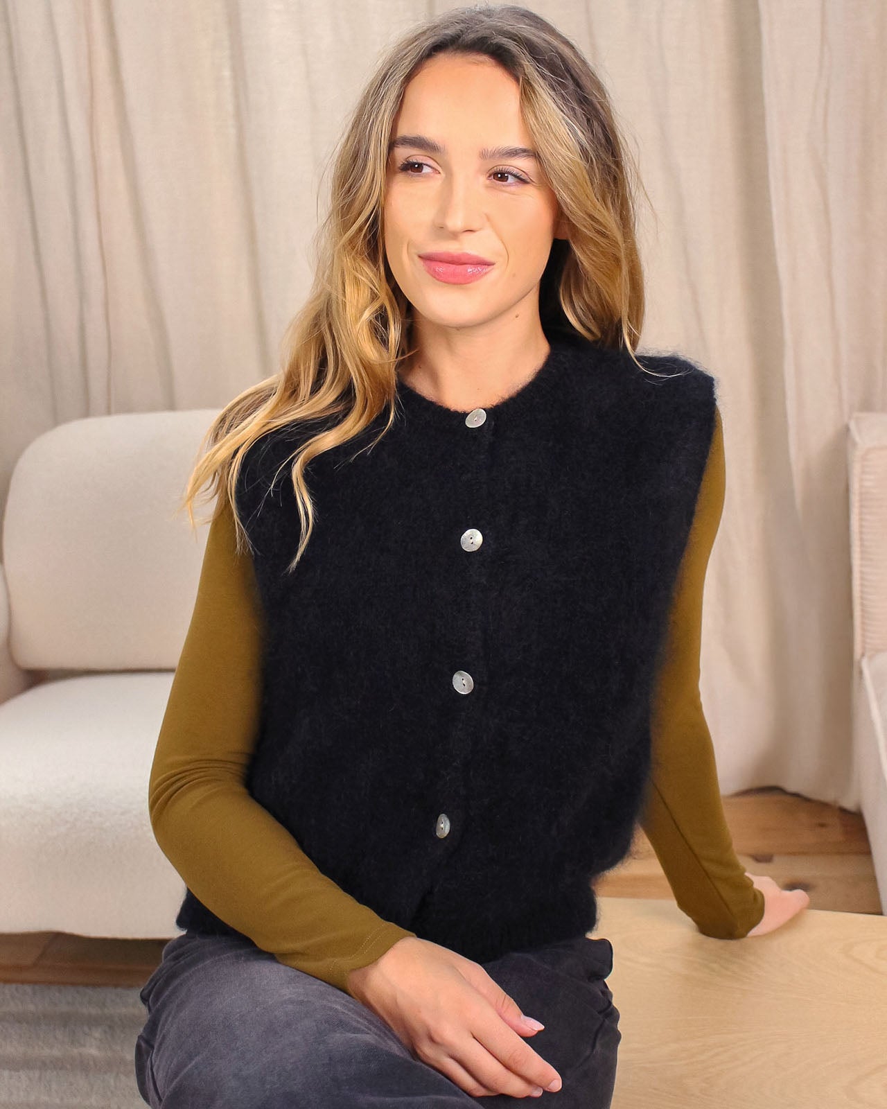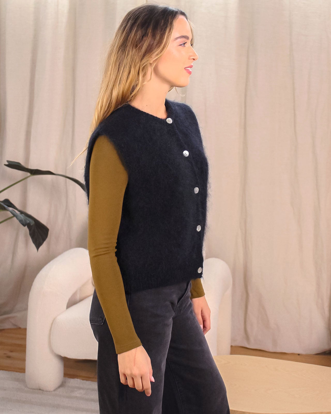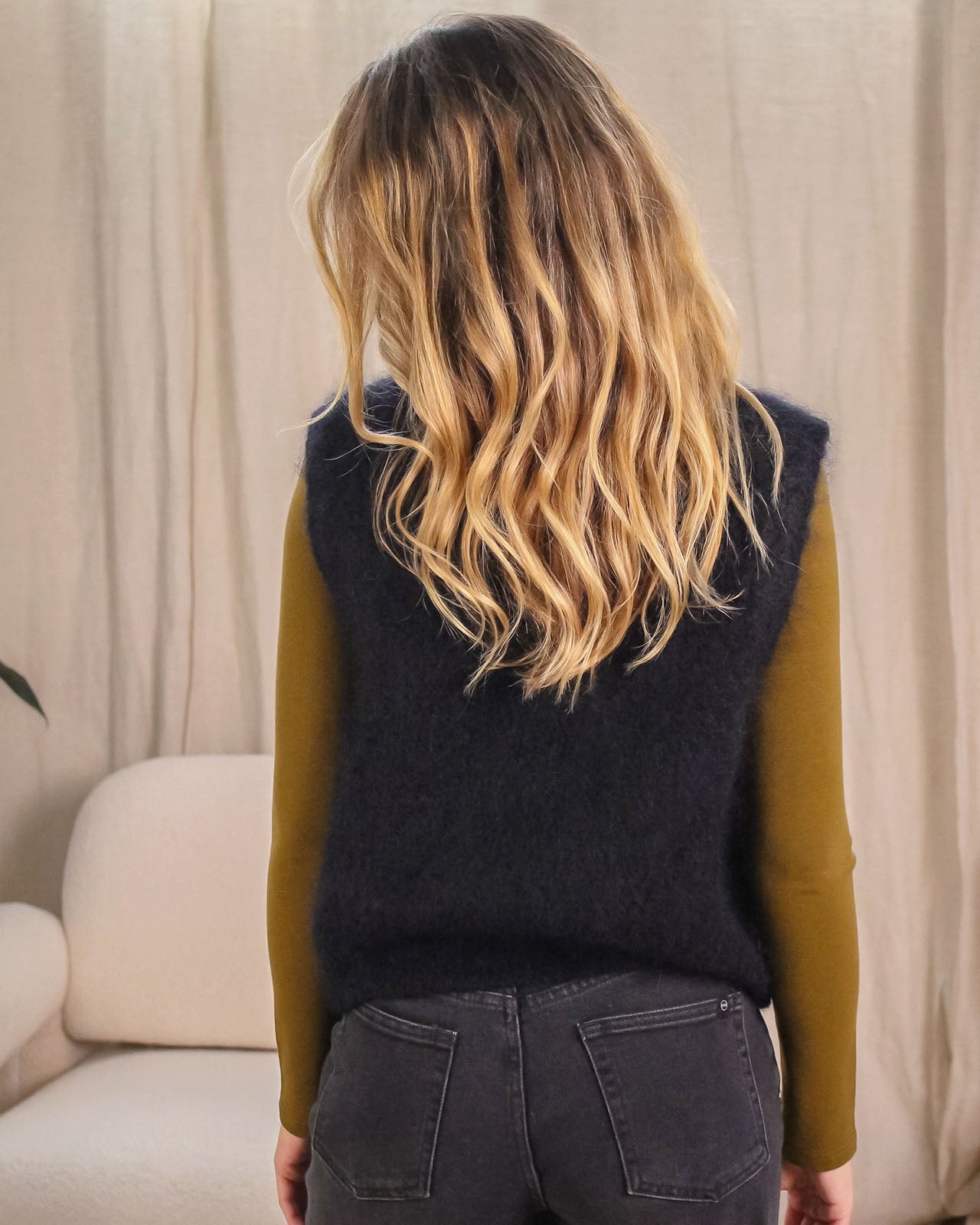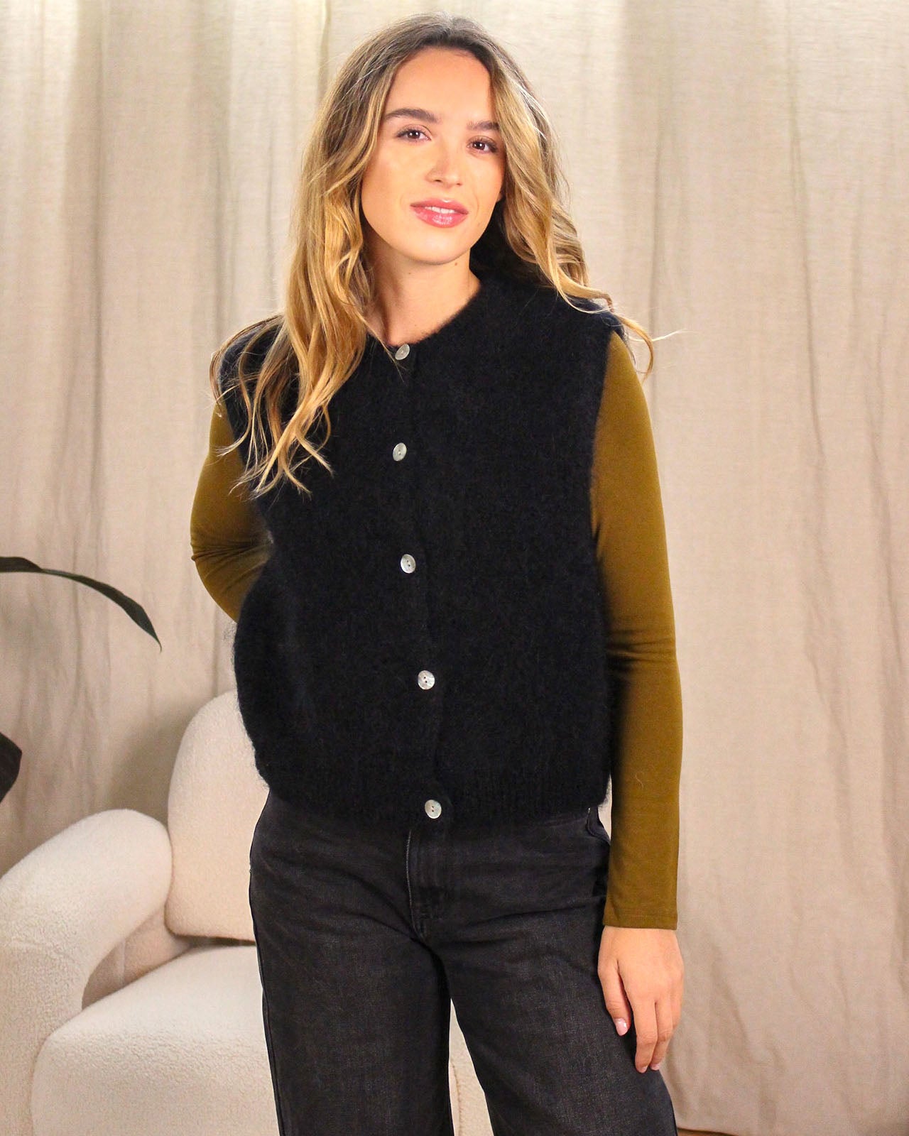 Le gilet Jimmy se porte sur une chemise ou un tee-shirt manches longues. On aime sa maille en mohair qui apporte une touche de douceur à nos looks !