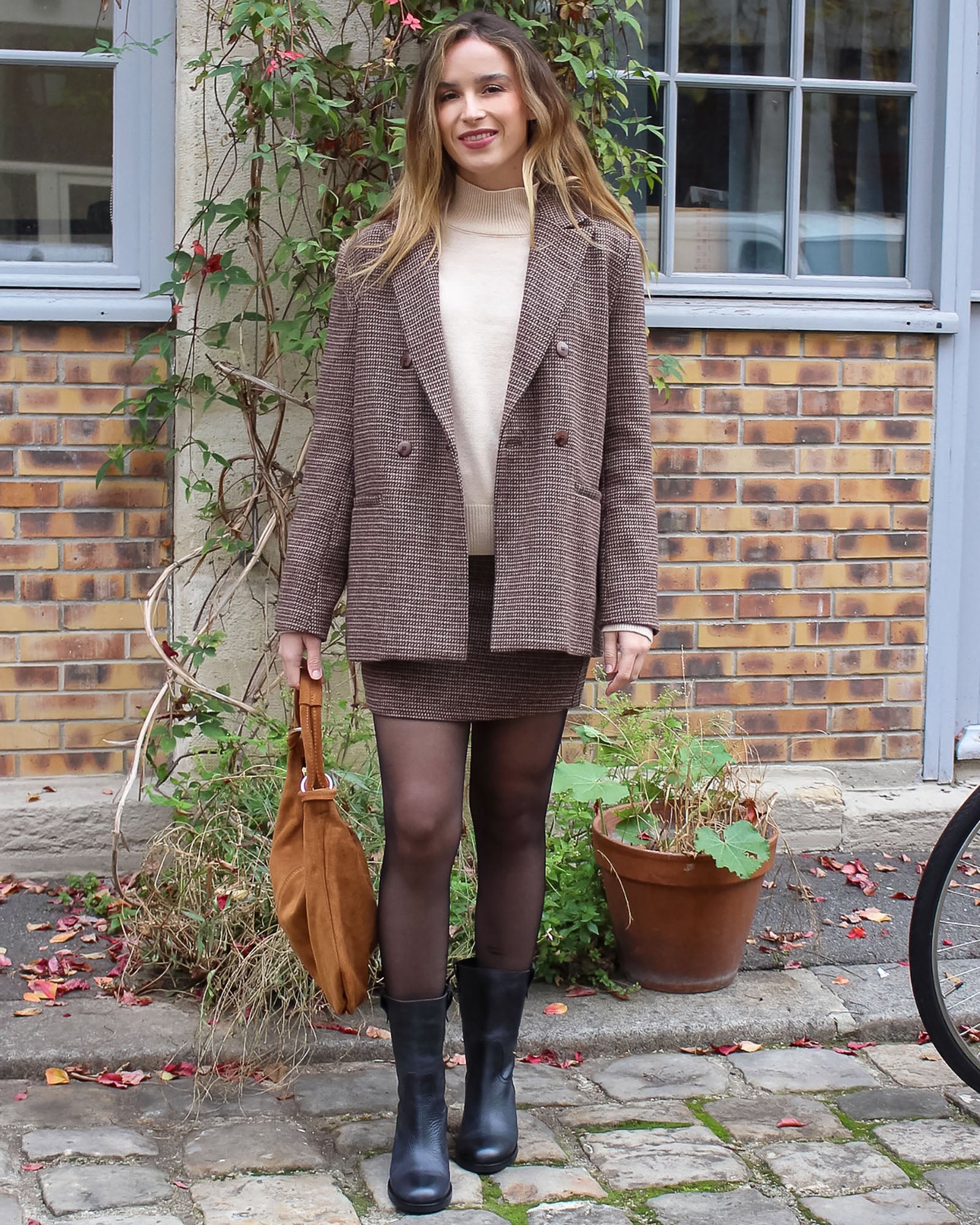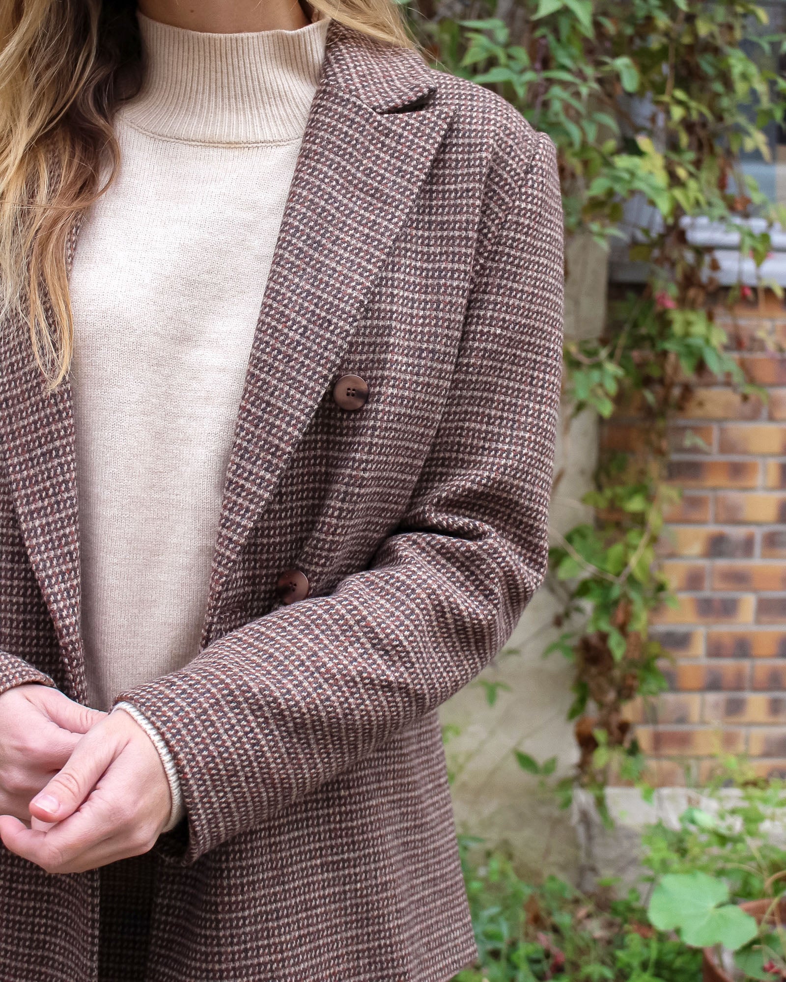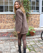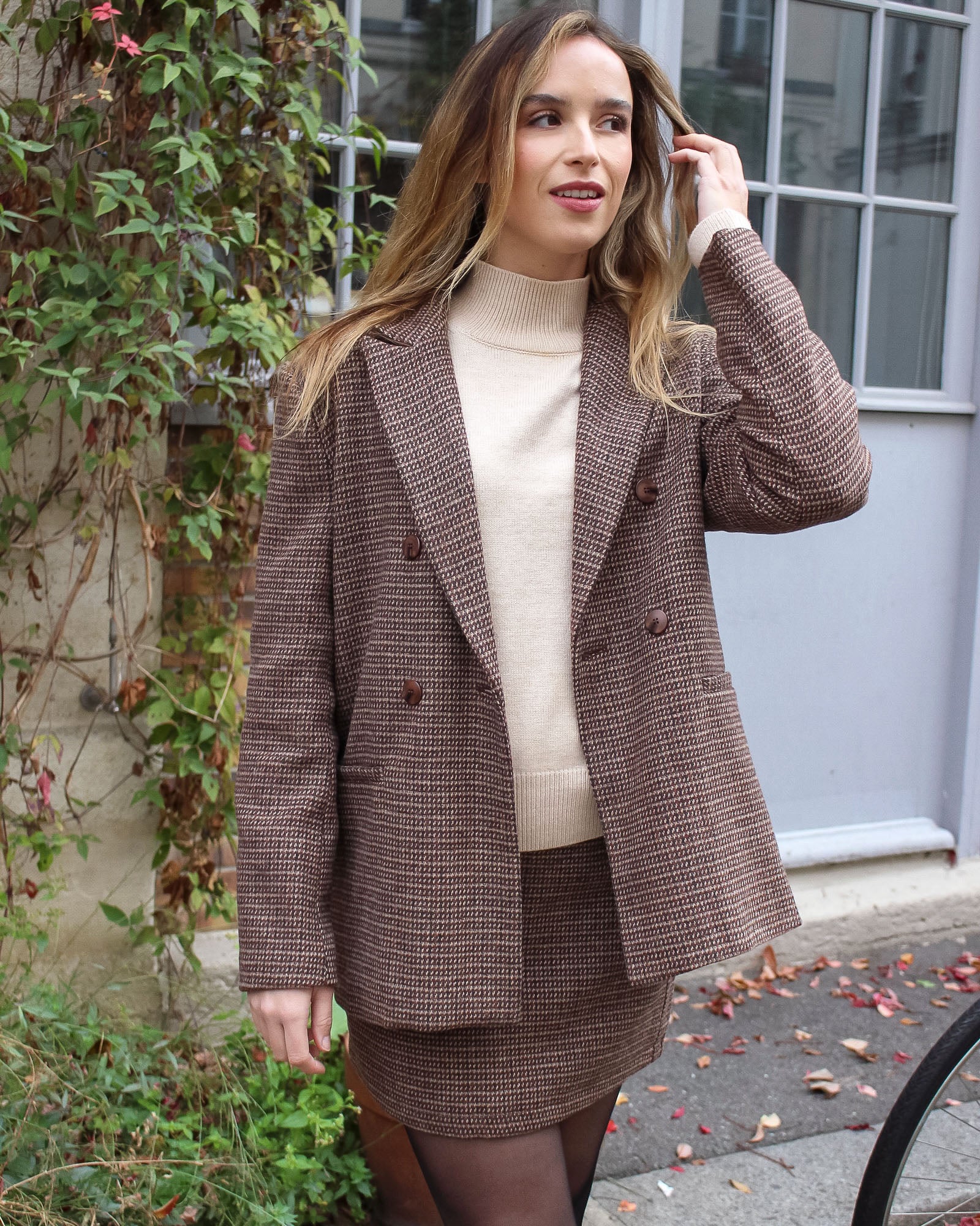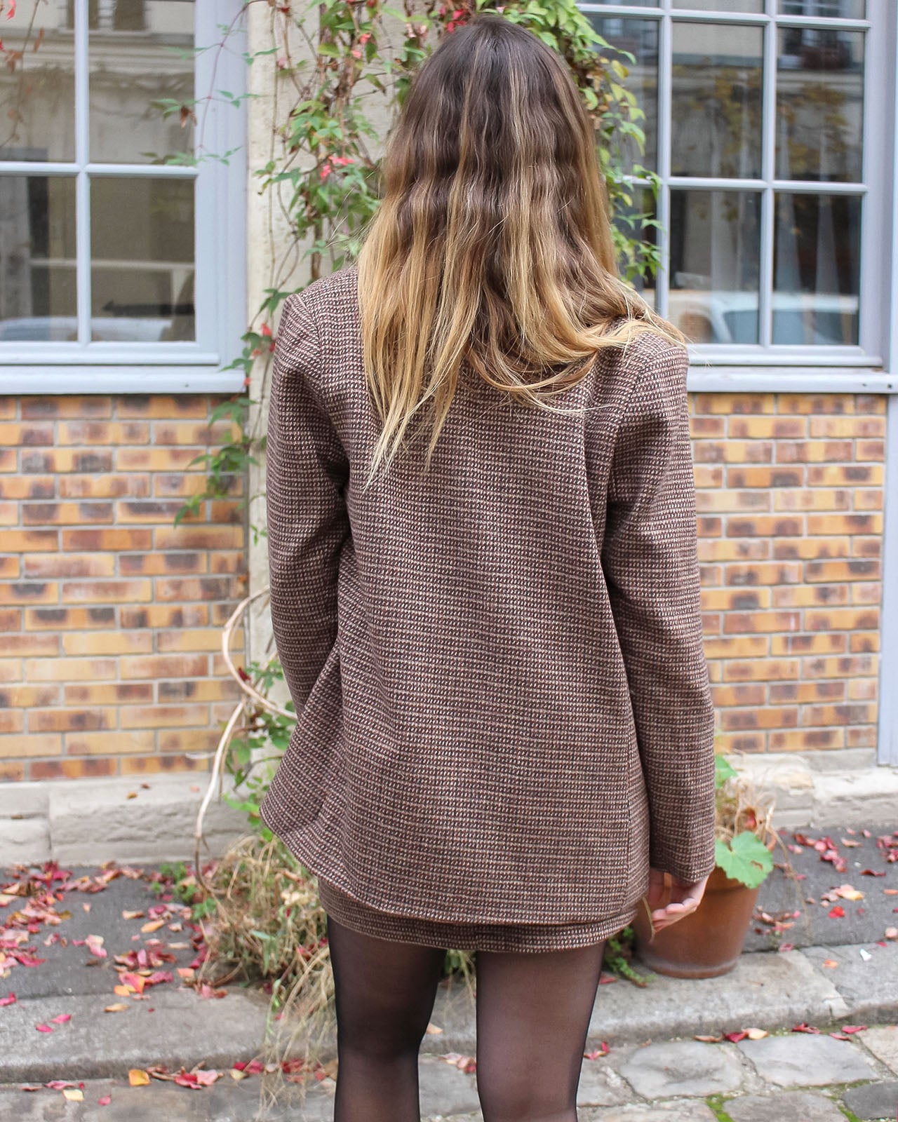 Le blazer à motif pied-de-poule Tresse forme un ensemble avec la jupe Bowen. Il est aussi canon porté avec un jean !