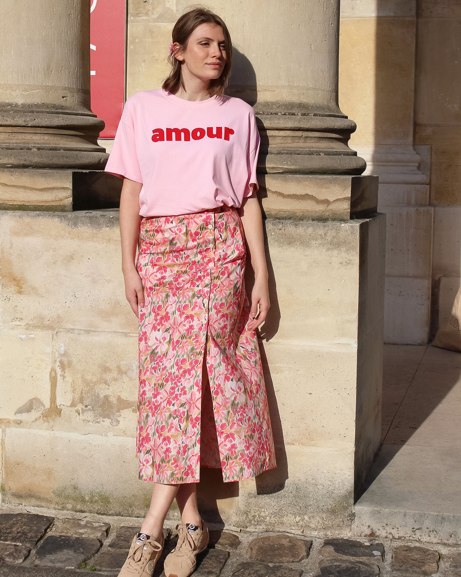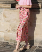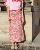 La jupe Josette souffle un vent de romantisme sur votre garde-robe avec son imprimé floral délicat et sa coupe midi fluide.