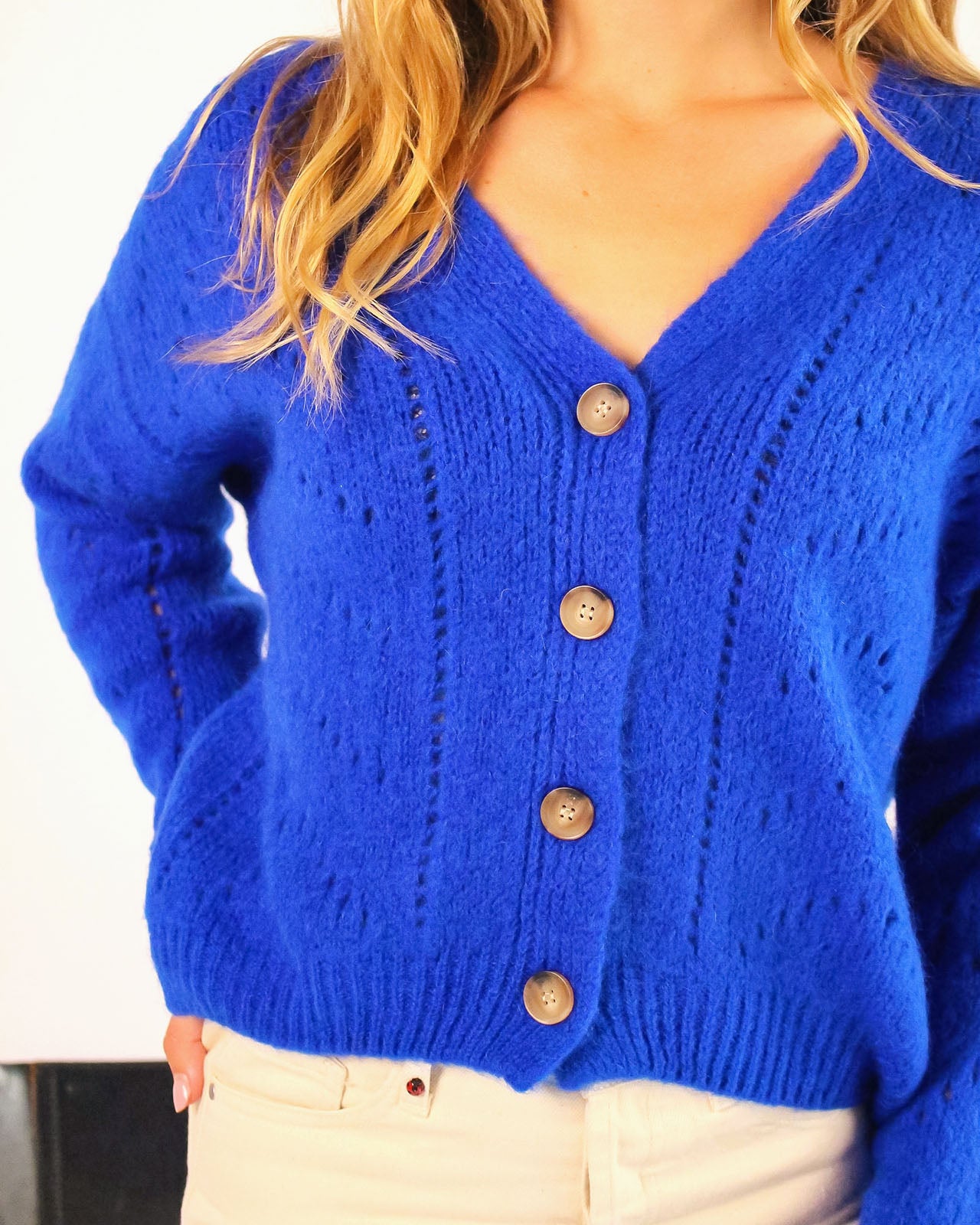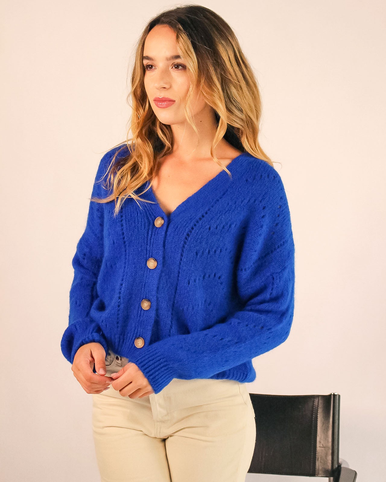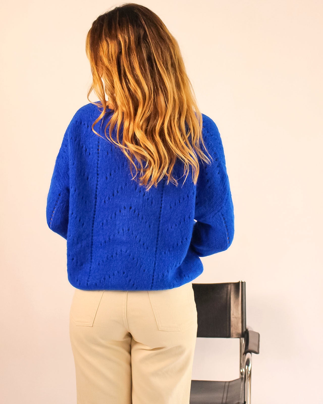 Le gilet Jasper, avec sa jolie maille ajourée, peut être porté à même la peau ou avec un top en-dessous.