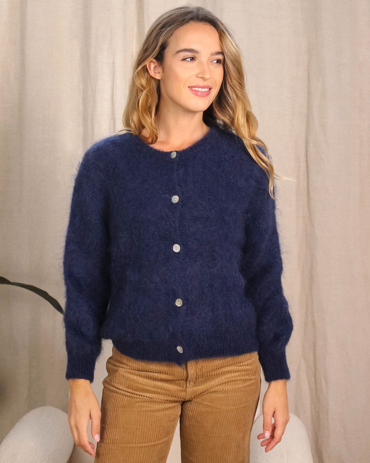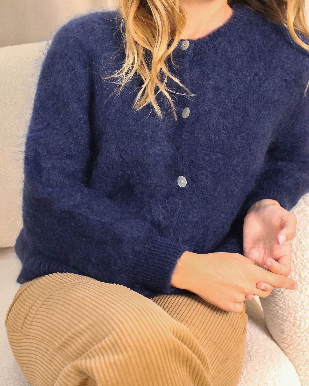 Une maille duveteuse et chaude en kid mohair : on adore le côté fluffy du gilet Carrick ! Il peut se porter boutonné jusqu'en haut comme un pull, ou ouvert sur un top.